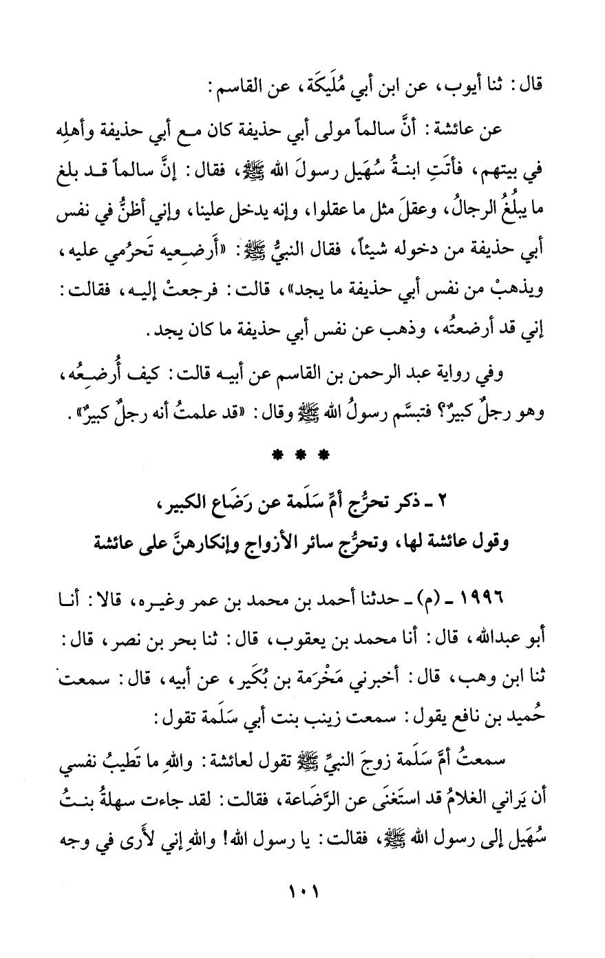 سمعت أم سلمة زوج النبي صلى الله عليه وسلم تقول لعائشة: والله ما تطيب نفسي أن يراني الغلام قد استغنى عن الرضاعة، فقالت: لقد جاءت سهلة بنت سهيل إلى رسول الله صلى الله عليه وسلم، فقالت: يا رسول الله! والله إني لأرى في وجه #102# أبي حذيفة من دخول سالم علي، قالت: فقال رسول الله صلى الله عليه وسلم: ((أرضعيه))، فقالت: إنه ذو لحية، فقال: ((أرضعيه يذهب ما في وجه أبي حذيفة))، قالت: فوالله ما عرفته في وجه أبي حذيفة.