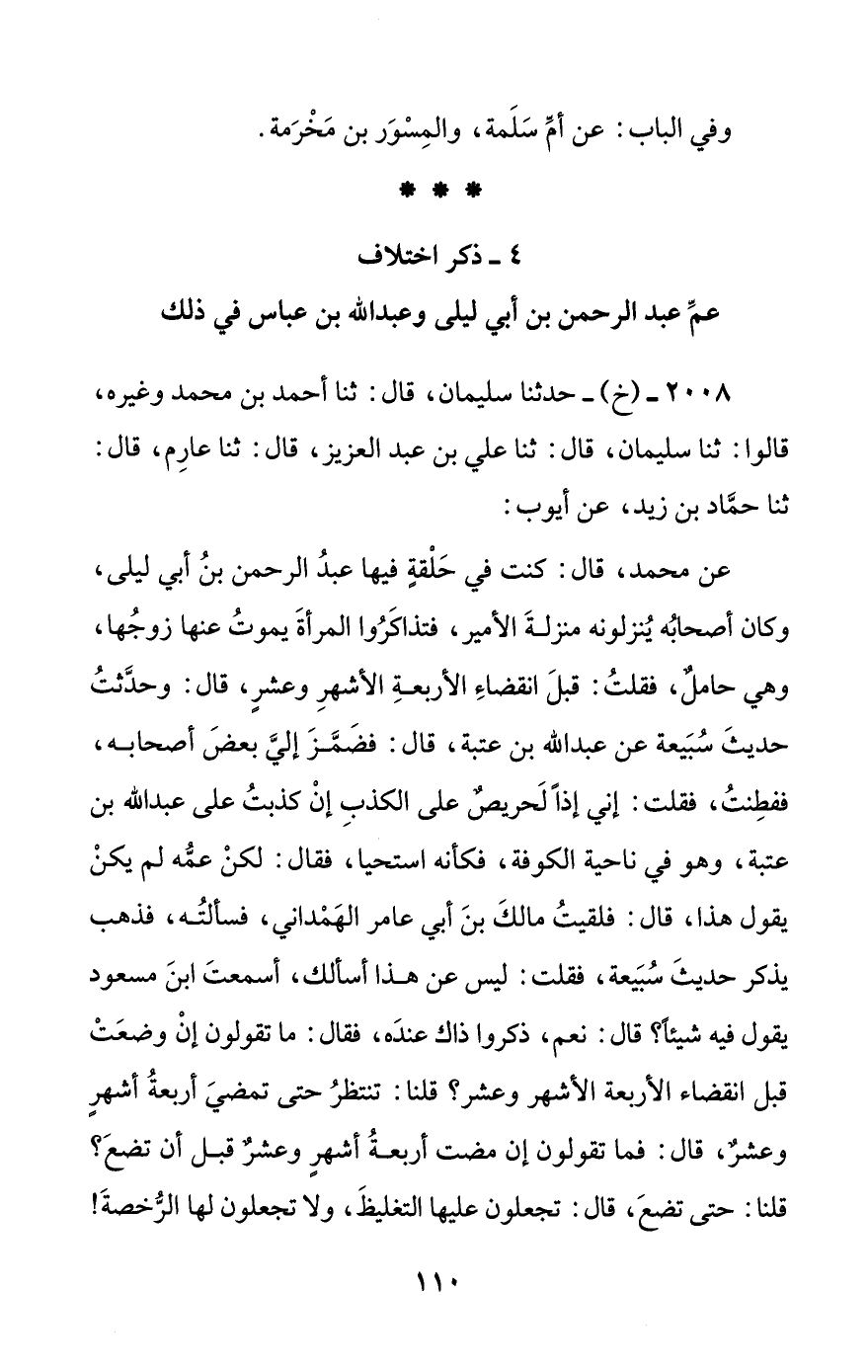 عن محمد، قال: كنت في حلقة فيها عبد الرحمن بن أبي ليلى، وكان أصحابه ينزلونه منزلة الأمير، فتذاكروا المرأة يموت عنها زوجها، وهي حامل، فقلت: قبل انقضاء الأربعة الأشهر وعشر، قال: وحدثت حديث سبيعة عن عبد الله بن عتبة، قال: فضمز إلي بعض أصحابه، ففطنت، فقلت: إني إذا لحريص على الكذب إن كذبت على عبد الله بن عتبة، وهو في ناحية الكوفة، فكأنه استحيا، فقال: لكن عمه لم يكن يقول هذا، قال: فلقيت مالك بن أبي عامر الهمداني، فسألته، فذهب يذكر حديث سبيعة، فقلت: ليس عن هذا أسألك، أسمعت ابن مسعود يقول فيه شيئا؟ قال: نعم، ذكروا ذاك عنده، فقال: ما تقولون إن وضعت قبل انقضاء الأربعة الأشهر وعشر؟ قلنا: تنتظر حتى تمضي أربعة أشهر وعشر، قال: فما تقولون إن مضت أربعة أشهر وعشر قبل أن تضع؟ قلنا: حتى تضع، قال: تجعلون عليها التغليظ، ولا تجعلون لها الرخصة! #111# لنزلت سورة النساء الصغرى -أو القصرى- بعد الطولى: {وأولات الأحمال أجلهن أن يضعن حملهن}.