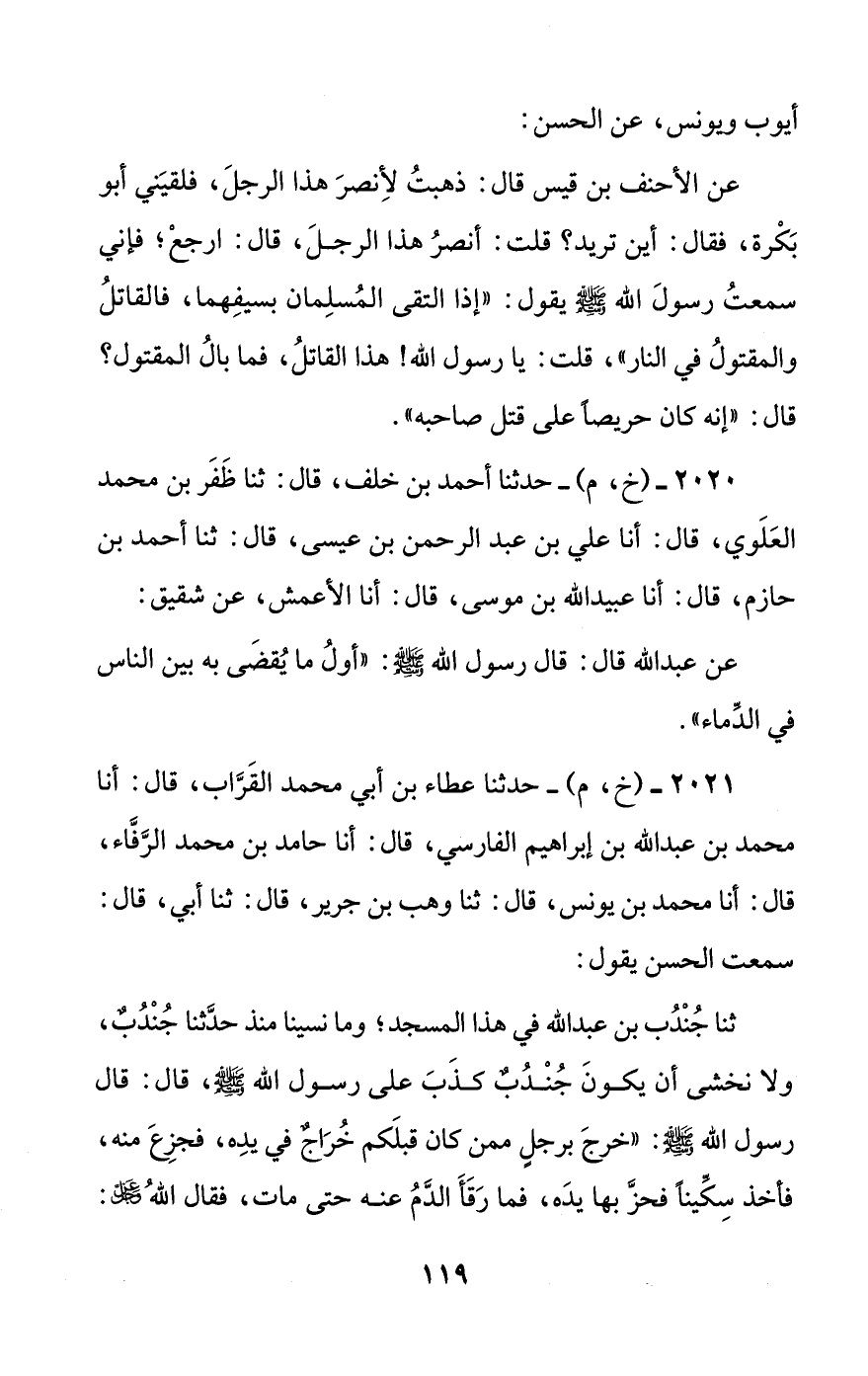 2021 - (خ، م) - حدثنا عطاء بن أبي محمد القراب، قال: أنا محمد بن عبد الله بن إبراهيم الفارسي، قال: أنا حامد بن محمد الرفاء، قال: أنا محمد بن يونس، قال: ثنا وهب بن جرير، قال: ثنا أبي، قال: سمعت الحسن يقول: