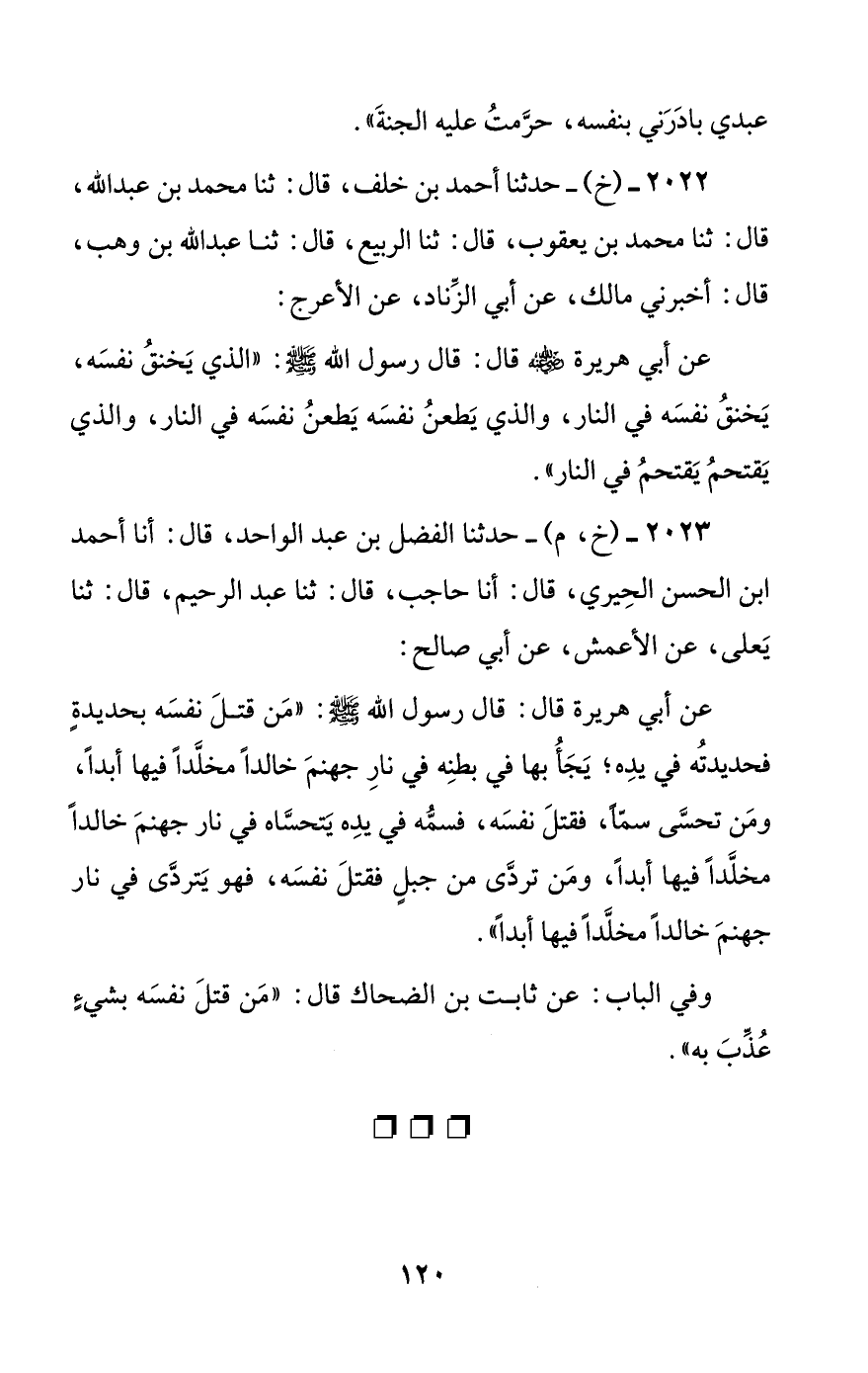 عن أبي هريرة قال: قال رسول الله صلى الله عليه وسلم: ((من قتل نفسه بحديدة فحديدته في يده؛ يجأ بها في بطنه في نار جهنم خالدا مخلدا فيها أبدا، ومن تحسى سما، فقتل نفسه، فسمه في يده يتحساه في نار جهنم خالدا مخلدا فيها أبدا، ومن تردى من جبل فقتل نفسه، فهو يتردى في نار جهنم خالدا مخلدا فيها أبدا)).
