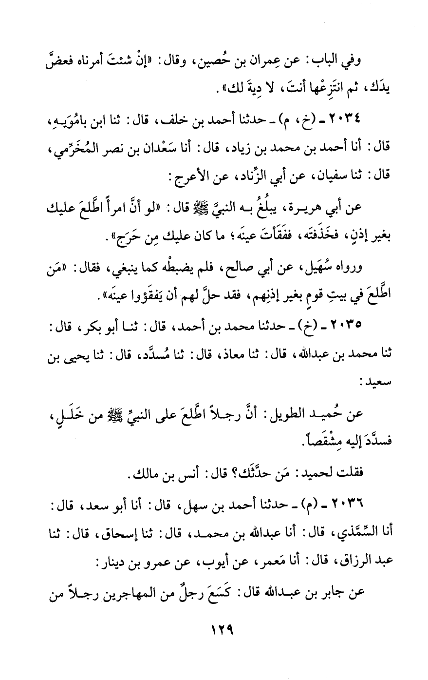 عن حميد الطويل: أن رجلا اطلع على النبي صلى الله عليه وسلم من خلل، فسدد إليه مشقصا.