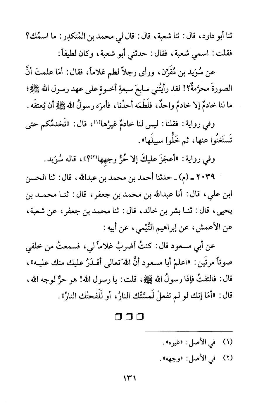 عن أبي مسعود قال: كنت أضرب غلاما لي، فسمعت من خلفي صوتا مرتين: ((اعلم أبا مسعود أن الله تعالى أقدر عليك منك عليه))، قال: فالتفت فإذا رسول الله صلى الله عليه وسلم، قلت: يا رسول الله! هو حر لوجه الله، قال: ((أما إنك لو لم تفعل لمستك النار، أو للفحتك النار)).