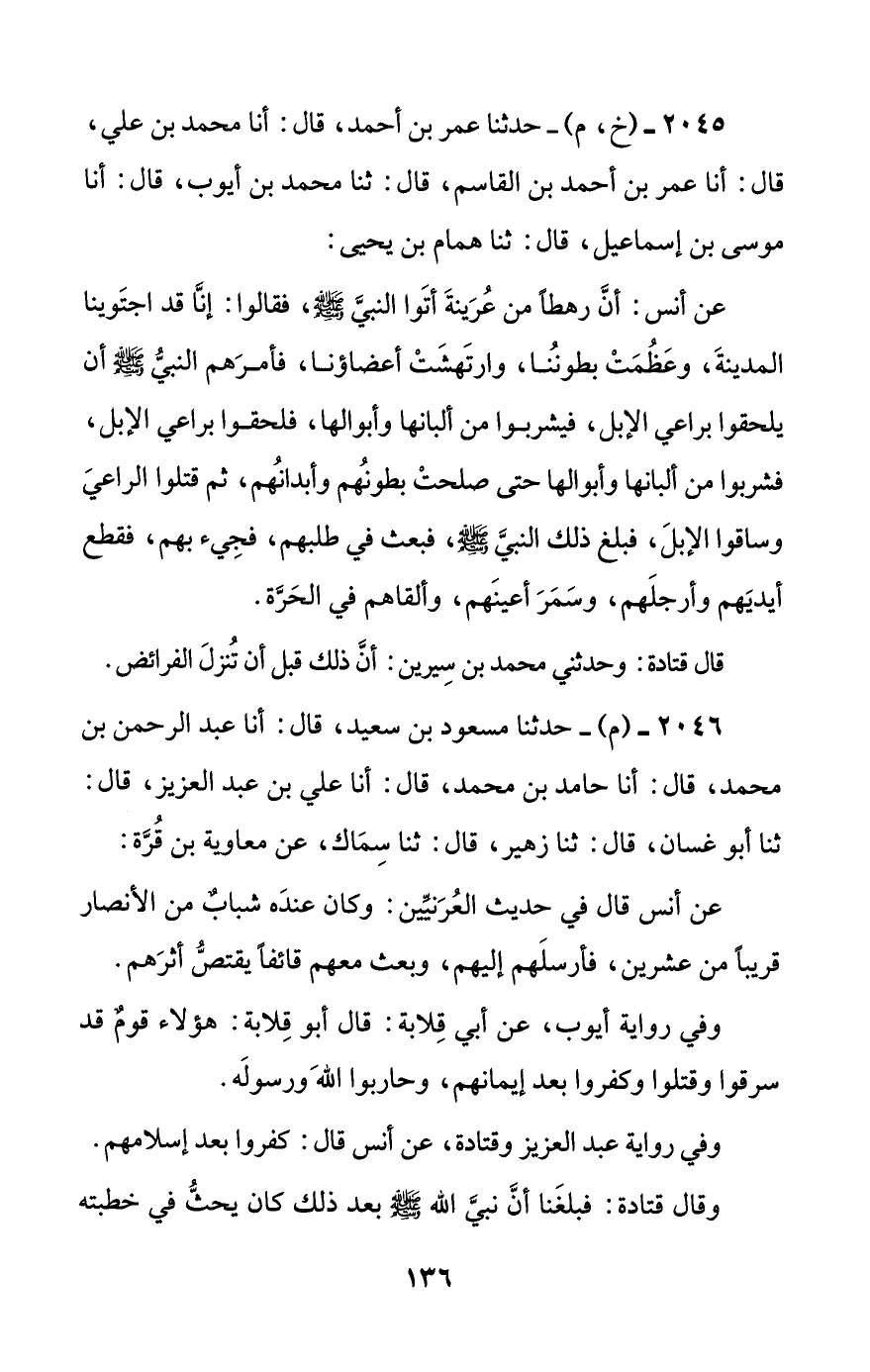 وفي رواية أيوب، عن أبي قلابة: قال أبو قلابة: هؤلاء قوم قد سرقوا وقتلوا وكفروا بعد إيمانهم، وحاربوا الله ورسوله.