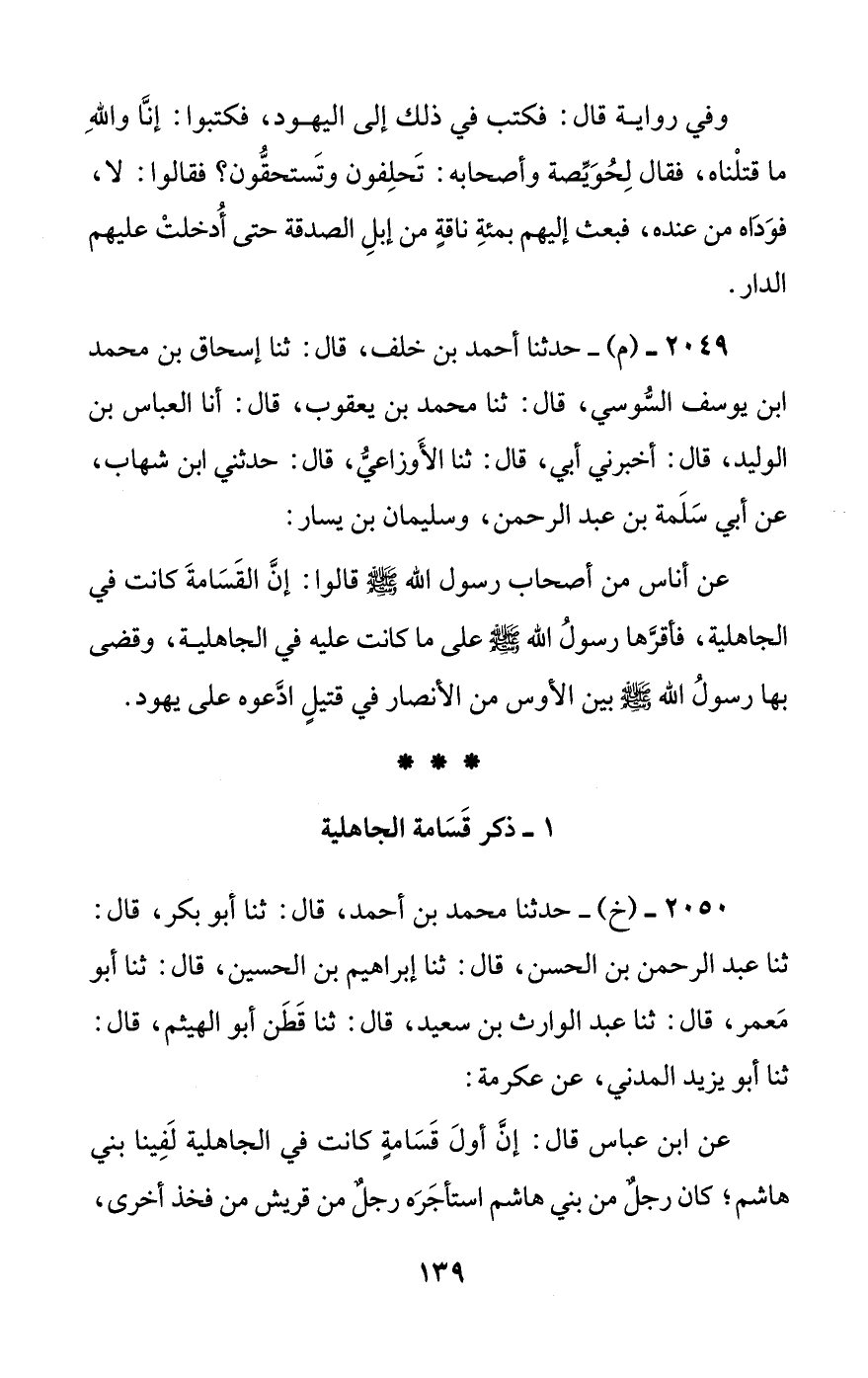 عن أناس من أصحاب رسول الله صلى الله عليه وسلم قالوا: إن القسامة كانت في الجاهلية، فأقرها رسول الله صلى الله عليه وسلم على ما كانت عليه في الجاهلية، وقضى بها رسول الله صلى الله عليه وسلم بين الأوس من الأنصار في قتيل ادعوه على يهود