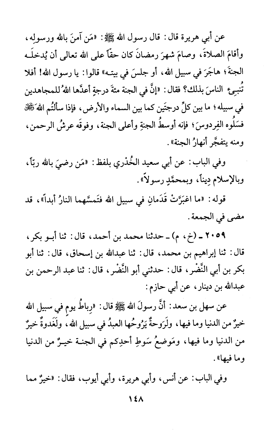 2059 - (خ، م) - حدثنا محمد بن أحمد، قال: ثنا أبو بكر، قال: ثنا إبراهيم بن محمد، قال: ثنا عبد الله بن إسحاق، قال: ثنا أبو بكر بن أبي النضر، قال: حدثني أبو النضر، قال: ثنا عبد الرحمن بن عبد الله بن دينار، عن أبي حازم: