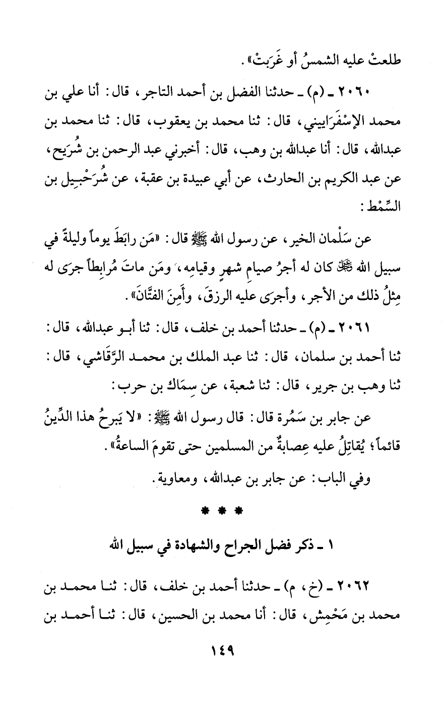 عن جابر بن سمرة قال: قال رسول الله صلى الله عليه وسلم: ((لا يبرح هذا الدين قائما؛ يقاتل عليه عصابة من المسلمين حتى تقوم الساعة)).
