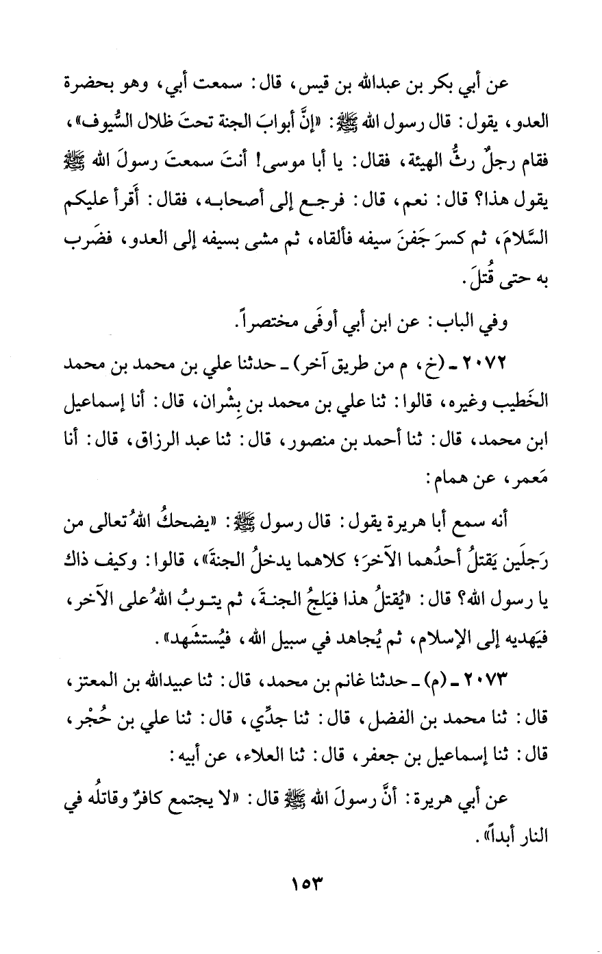أنه سمع أبا هريرة يقول: قال رسول الله صلى الله عليه وسلم: ((يضحك الله تعالى من رجلين يقتل أحدهما الآخر؛ كلاهما يدخل الجنة))، قالوا: وكيف ذاك يا رسول الله؟ قال: ((يقتل هذا فيلج الجنة، ثم يتوب الله على الآخر، فيهديه إلى الإسلام، ثم يجاهد في سبيل الله، فيستشهد)).