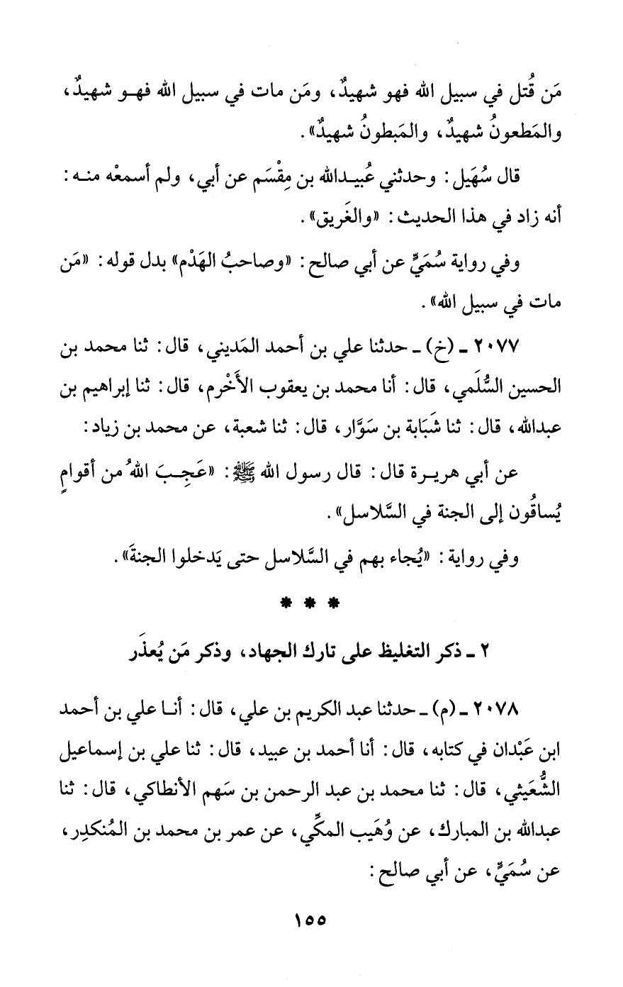 2078 - (م) - حدثنا عبد الكريم بن علي، قال: أنا علي بن أحمد بن عبدان في كتابه، قال: أنا أحمد بن عبيد، قال: ثنا علي بن إسماعيل الشعيثي، قال: ثنا محمد بن عبد الرحمن بن سهم الأنطاكي، قال: ثنا عبد الله بن المبارك، عن وهيب المكي، عن عمر بن محمد بن المنكدر، عن سمي، عن أبي صالح: