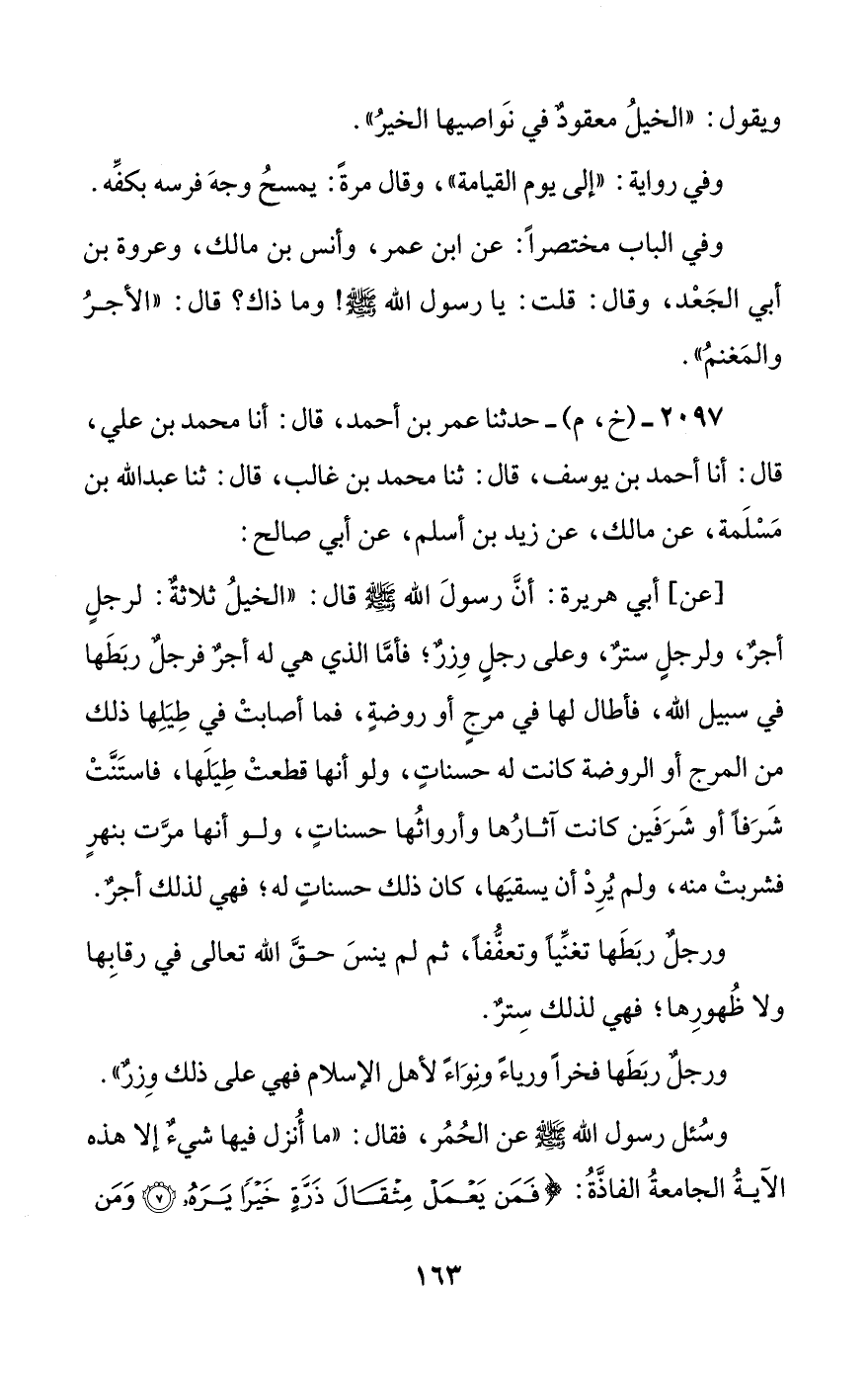 [عن] أبي هريرة: أن رسول الله صلى الله عليه وسلم قال: ((الخيل ثلاثة: لرجل أجر، ولرجل ستر، وعلى رجل وزر؛ فأما الذي هي له أجر فرجل ربطها في سبيل الله، فأطال لها في مرج أو روضة، فما أصابت في طيلها ذلك من المرج أو الروضة كانت له حسنات، ولو أنها قطعت طيلها، فاستنت شرفا أو شرفين كانت آثارها وأرواثها حسنات، ولو أنها مرت بنهر فشربت منه، ولم يرد أن يسقيها، كان ذلك حسنات له؛ فهي لذلك أجر.
