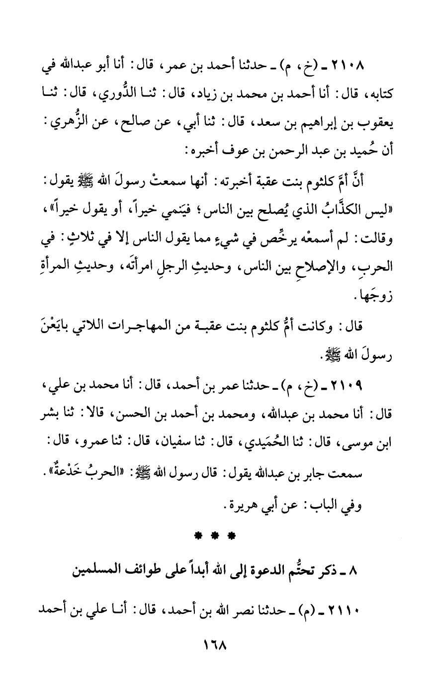 2109 - (خ، م) - حدثنا عمر بن أحمد، قال: أنا محمد بن علي، قال: أنا محمد بن عبد الله، ومحمد بن أحمد بن الحسن، قالا: ثنا بشر بن موسى، قال: ثنا الحميدي، قال: ثنا سفيان، قال: ثنا عمرو، قال: