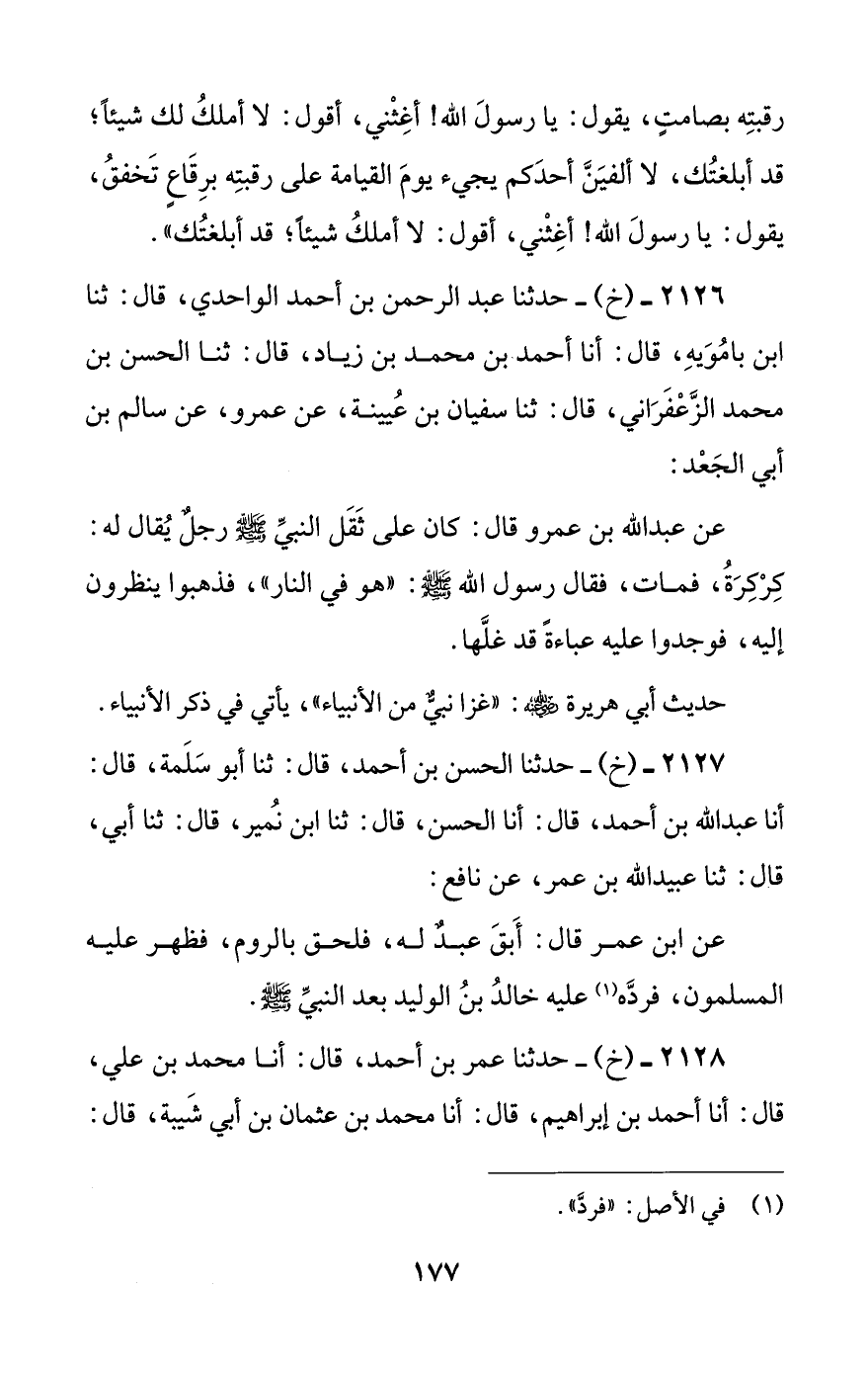 2126 - (خ) - حدثنا عبد الرحمن بن أحمد الواحدي، قال: ثنا ابن بامويه، قال: أنا أحمد بن محمد بن زياد، قال: ثنا الحسن بن محمد الزعفراني، قال: ثنا سفيان بن عيينة، عن عمرو، عن سالم بن أبي الجعد: