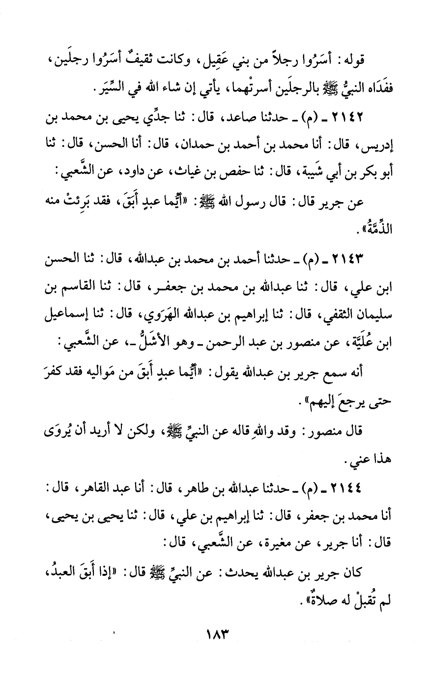 2144 - (م) - حدثنا عبد الله بن طاهر، قال: أنا عبد القاهر، قال: أنا محمد بن جعفر، قال: ثنا إبراهيم بن علي، قال: ثنا يحيى بن يحيى، قال: أنا جرير، عن مغيرة، عن الشعبي، قال: