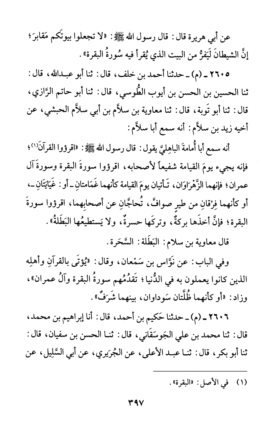 2605 - (م) - حدثنا أحمد بن خلف، قال: ثنا أبو عبد الله، قال: ثنا الحسين بن الحسن بن أيوب الطوسي، قال: ثنا أبو حاتم الرازي، قال: ثنا أبو توبة، قال: ثنا معاوية بن سلام بن أبي سلام الحبشي، عن أخيه زيد بن سلام: أنه سمع أبا سلام: