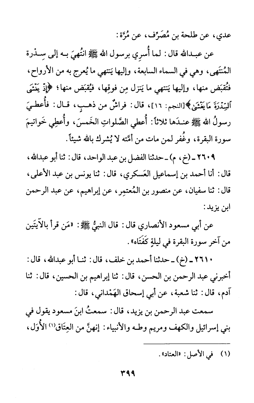 2609 - (خ، م) - حدثنا الفضل بن عبد الواحد، قال: ثنا أبو عبد الله، قال: أنا أحمد بن إسماعيل العسكري، قال: ثنا يونس بن عبد الأعلى، قال: ثنا سفيان، عن منصور بن المعتمر، عن إبراهيم، عن عبد الرحمن بن يزيد: