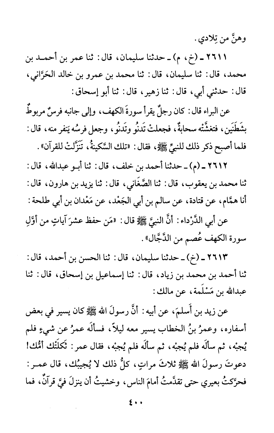 2611 - (خ، م) - حدثنا سليمان، قال: ثنا عمر بن أحمد بن محمد، قال: ثنا سليمان، قال: ثنا محمد بن عمرو بن خالد الحراني، قال: حدثني أبي، قال: ثنا زهير، قال: ثنا أبو إسحاق: