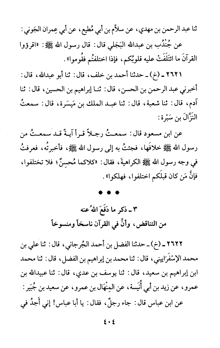 عن ابن مسعود قال: سمعت رجلا قرأ آية قد سمعت من رسول الله صلى الله عليه وسلم خلافها، فجئت به إلى رسول الله صلى الله عليه وسلم، فأخبرته، فعرفت في وجه رسول الله صلى الله عليه وسلم الكراهية، فقال: ((كلاكما محسن؛ فلا تختلفوا، فإن من كان قبلكم اختلفوا، فهلكوا)).