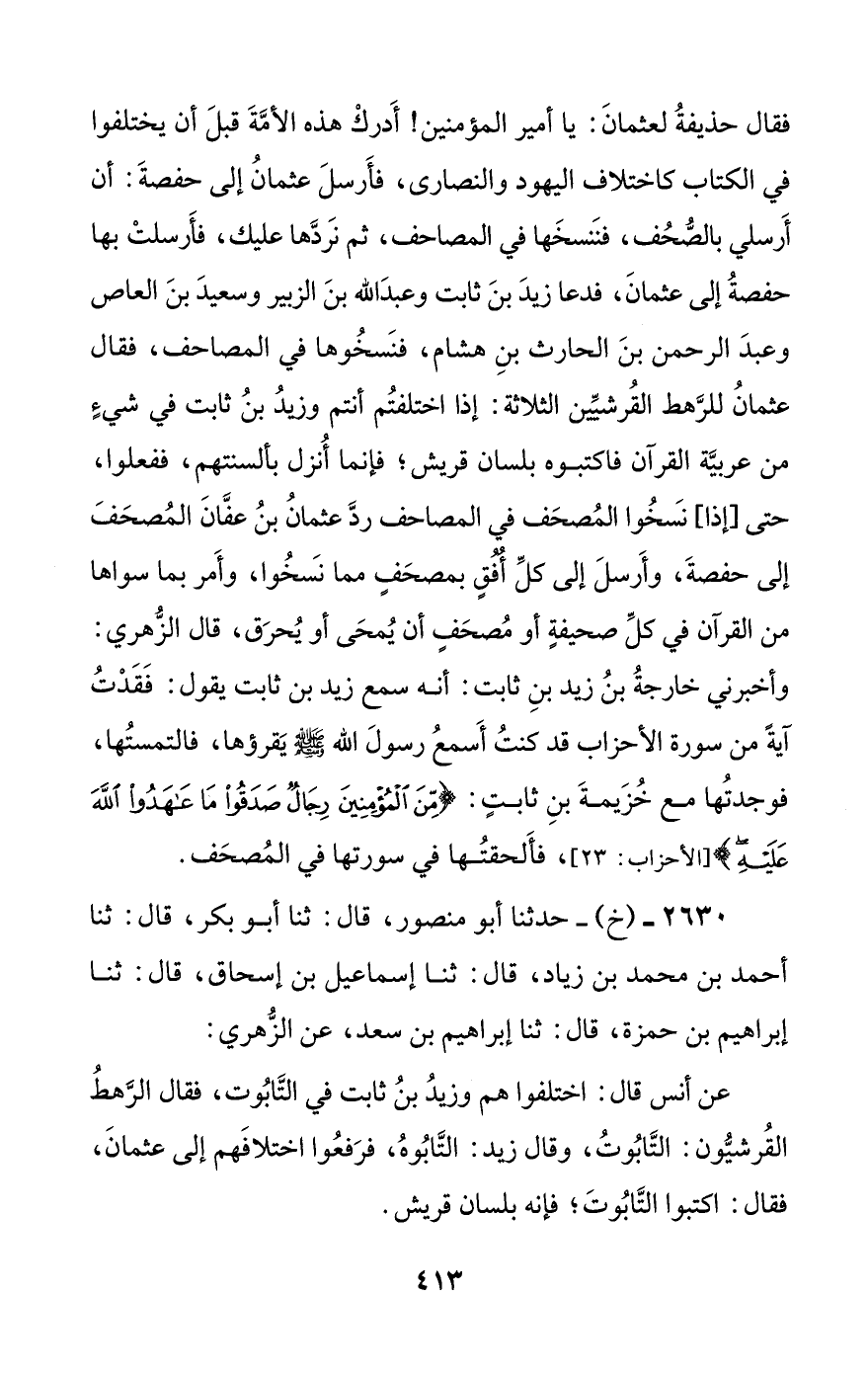 2630 - (خ) - حدثنا أبو منصور، قال: ثنا أبو بكر، قال: ثنا أحمد بن محمد بن زياد، قال: ثنا إسماعيل بن إسحاق، قال: ثنا إبراهيم بن حمزة، قال: ثنا إبراهيم بن سعد، عن الزهري: