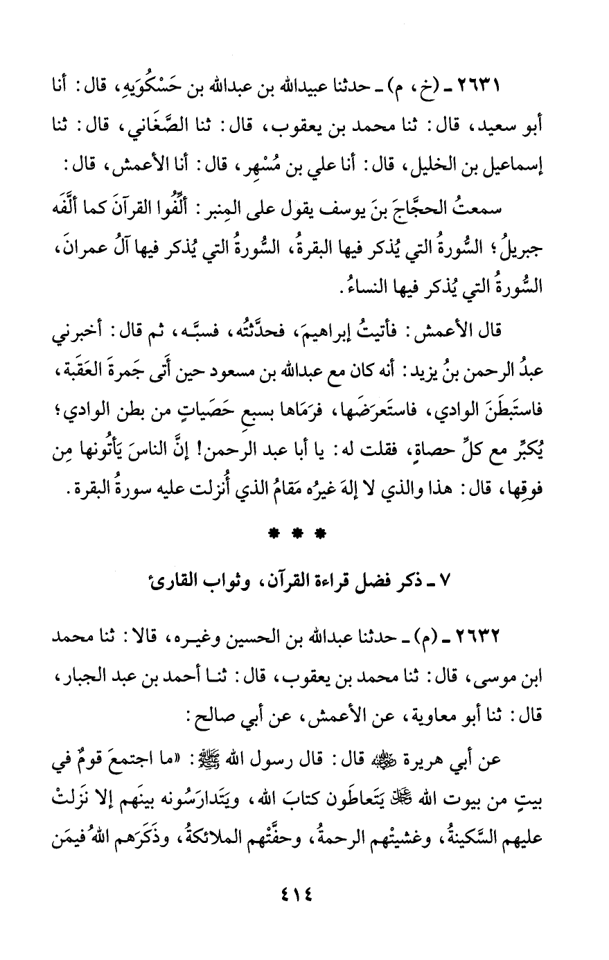 عن أبي هريرة رضي الله عنه قال: قال رسول الله صلى الله عليه وسلم: ((ما اجتمع قوم في بيت من بيوت الله عز وجل يتعاطون كتاب الله، ويتدارسونه بينهم إلا نزلت عليهم السكينة، وغشيتهم الرحمة، وحفتهم الملائكة، وذكرهم الله فيمن #415# عنده؛ ومن أبطأ به عمله، لم يسرع به نسبه)).