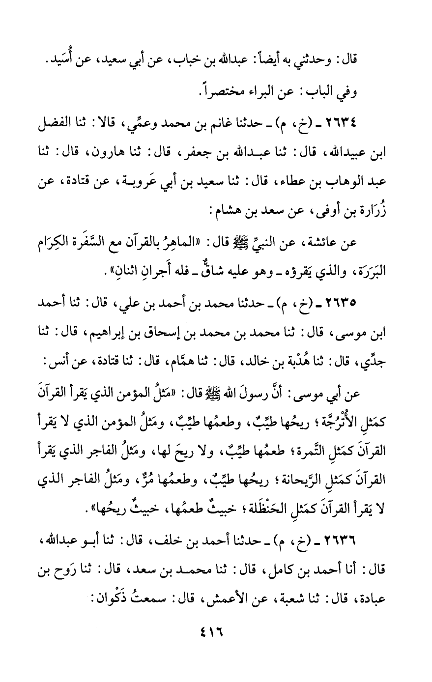 2634 - (خ، م) - حدثنا غانم بن محمد وعمي، قالا: ثنا الفضل بن عبيد الله، قال: ثنا عبد الله بن جعفر، قال: ثنا هارون، قال: ثنا عبد الوهاب بن عطاء، قال: ثنا سعيد بن أبي عروبة، عن قتادة، عن زرارة بن أوفى، عن سعد بن هشام: