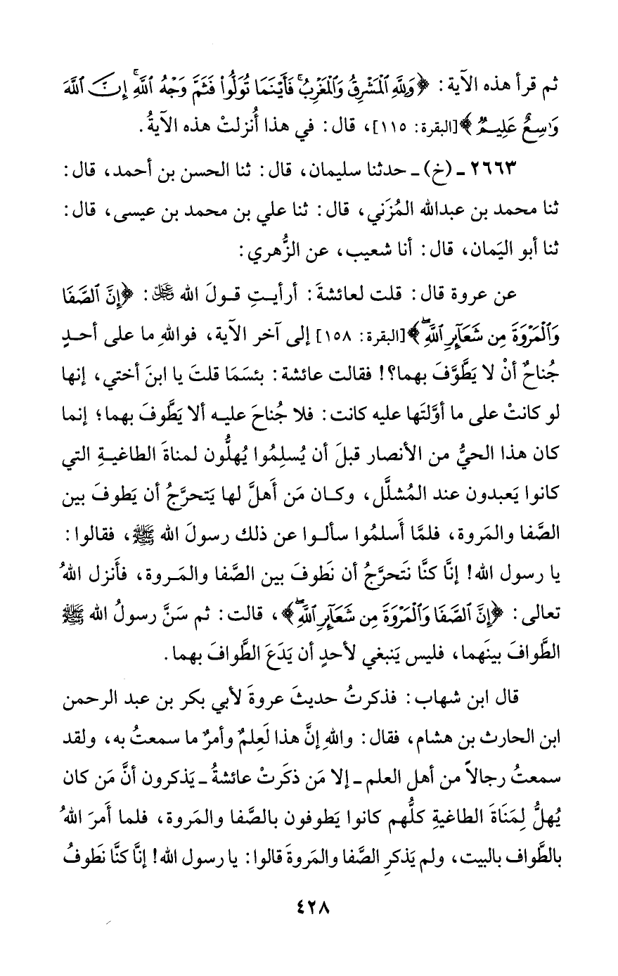 عن عروة قال: قلت لعائشة: أرأيت قول الله عز وجل: {إن الصفا والمروة من شعائر الله} إلى آخر الآية، فوالله ما على أحد جناح أن لا يطوف بهما؟! فقالت عائشة: بئسما قلت يا ابن أختي، إنها لو كانت على ما أولتها عليه كانت: فلا جناح عليه ألا يطوف بهما؛ إنما كان هذا الحي من الأنصار قبل أن يسلموا يهلون لمناة الطاغية التي كانوا يعبدون عند المشلل، وكان من أهل لها يتحرج أن يطوف بين الصفا والمروة، فلما أسلموا سألوا عن ذلك رسول الله صلى الله عليه وسلم، فقالوا: يا رسول الله! إنا كنا نتحرج أن نطوف بين الصفا والمروة، فأنزل الله تعالى: {إن الصفا والمروة من شعائر الله}، قالت: ثم سن رسول الله صلى الله عليه وسلم الطواف بينهما، فليس ينبغي لأحد أن يدع الطواف بهما.