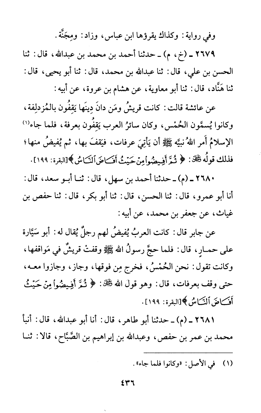 عن عائشة قالت: كانت قريش ومن دان دينها يقفون بالمزدلفة، وكانوا يسمون الحمس، وكان سائر العرب يقفون بعرفة، فلما جاء الإسلام أمر الله نبيه صلى الله عليه وسلم أن يأتي عرفات، فيقف بها، ثم يفيض منها؛ فذلك قوله عز وجل: {ثم أفيضوا من حيث أفاض الناس}.