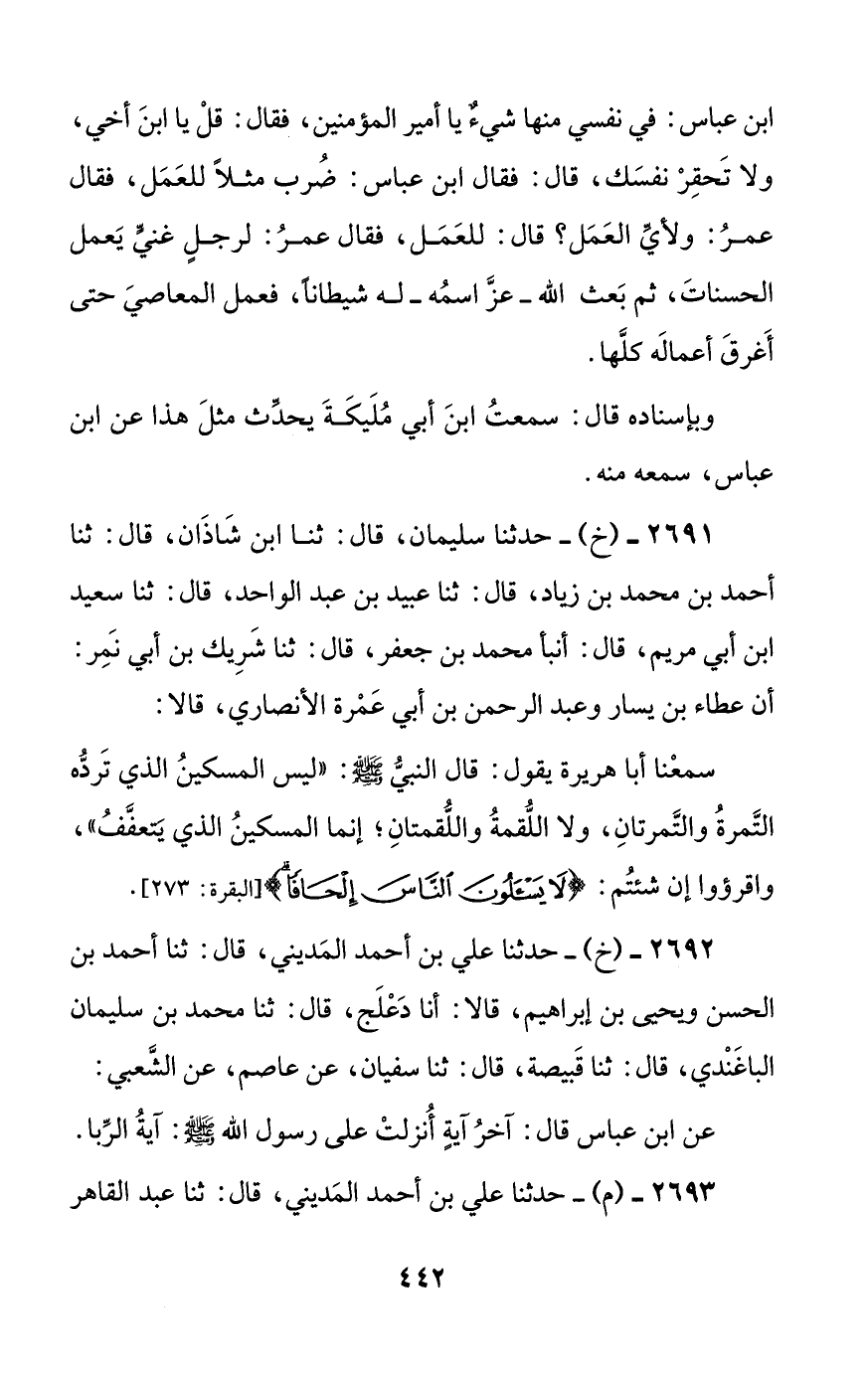 سمعنا أبا هريرة يقول: قال النبي صلى الله عليه وسلم: ((ليس المسكين الذي ترده التمرة والتمرتان، ولا اللقمة واللقمتان؛ إنما المسكين الذي يتعفف))، واقرؤوا إن شئتم: {لا يسئلون الناس إلحافا}.