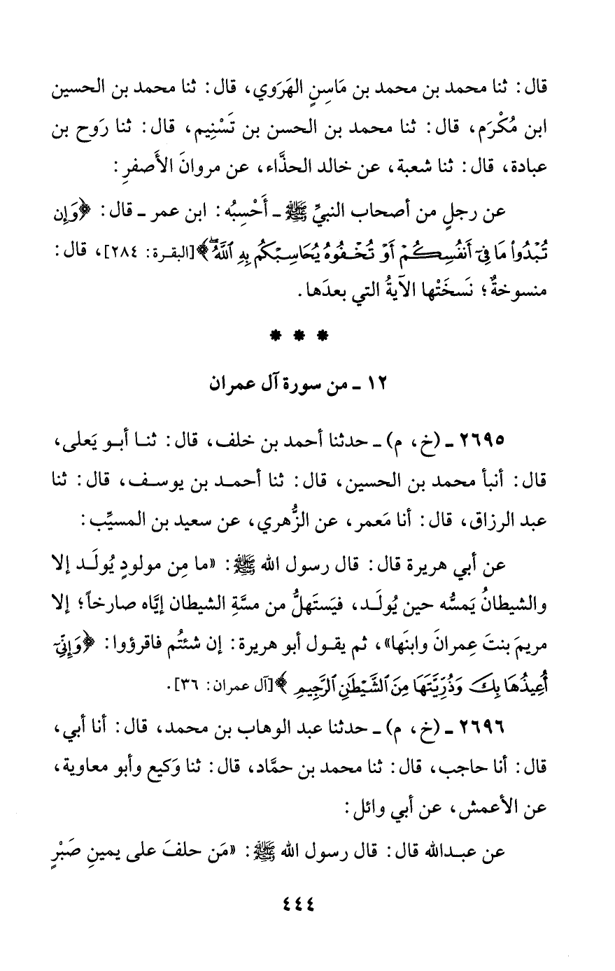 2696 - (خ، م) - حدثنا عبد الوهاب بن محمد، قال: أنا أبي، قال: أنا حاجب، قال: ثنا محمد بن حماد، قال: ثنا وكيع وأبو معاوية، عن الأعمش، عن أبي وائل: