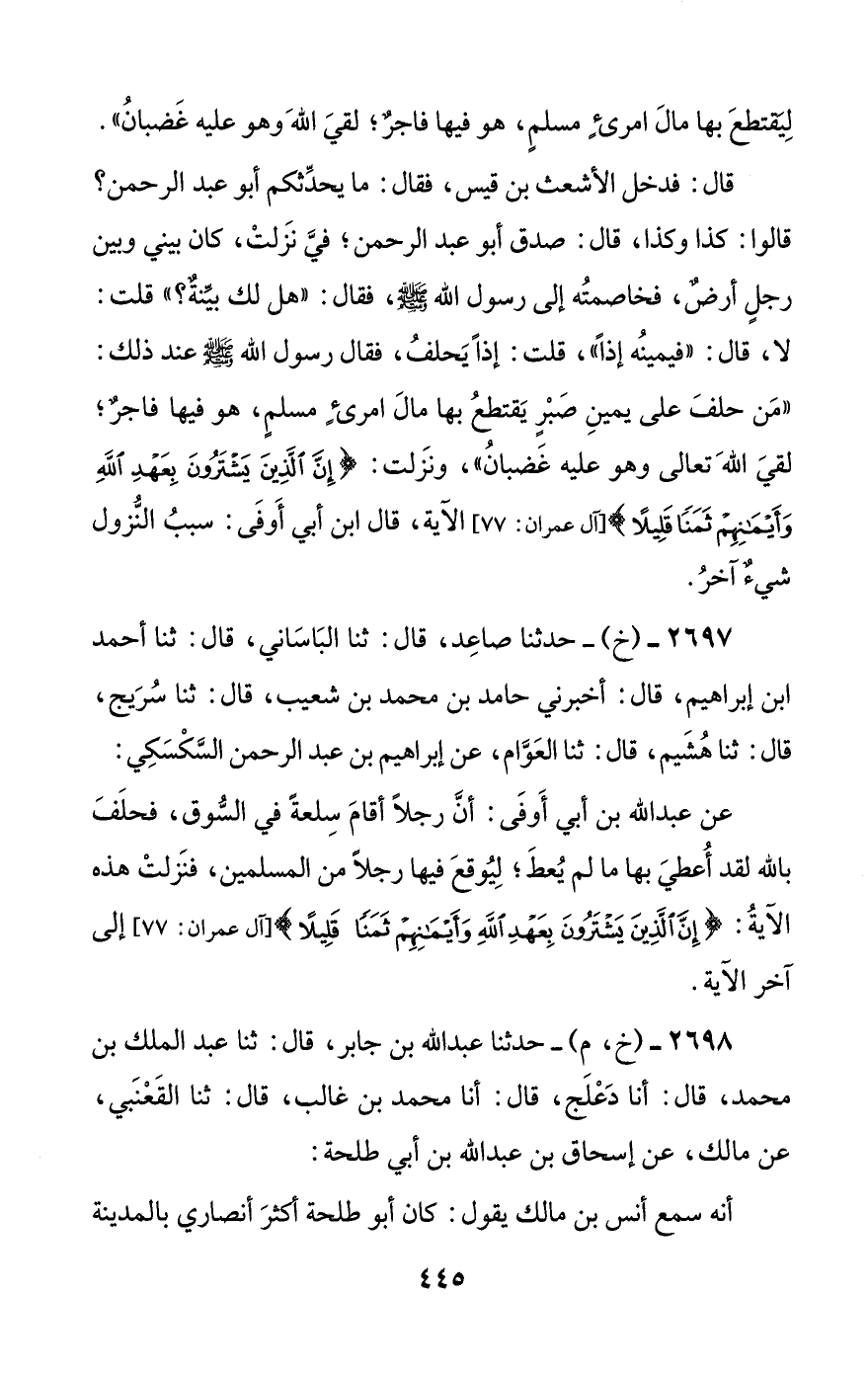 2698 - (خ، م) - حدثنا عبد الله بن جابر، قال: ثنا عبد الملك بن محمد، قال: أنا دعلج، قال: أنا محمد بن غالب، قال: ثنا القعنبي، عن مالك، عن إسحاق بن عبد الله بن أبي طلحة: