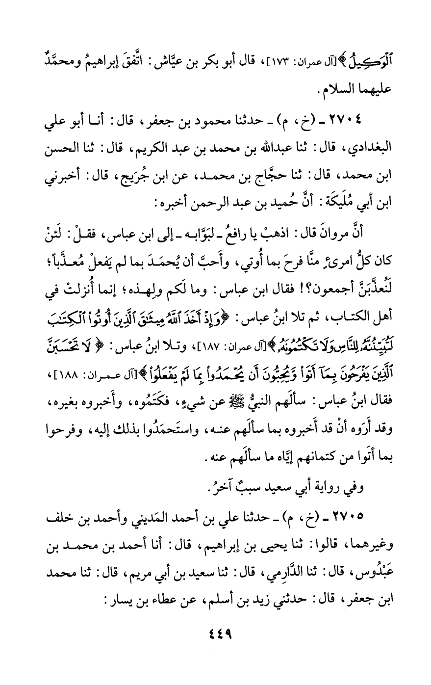 2704 - (خ، م) - حدثنا محمود بن جعفر، قال: أنا أبو علي البغدادي، قال: ثنا عبد الله بن محمد بن عبد الكريم، قال: ثنا الحسن بن محمد، قال: ثنا حجاج بن محمد، عن ابن جريج، قال: أخبرني ابن أبي ملكية: أن حميد بن عبد الرحمن أخبره: