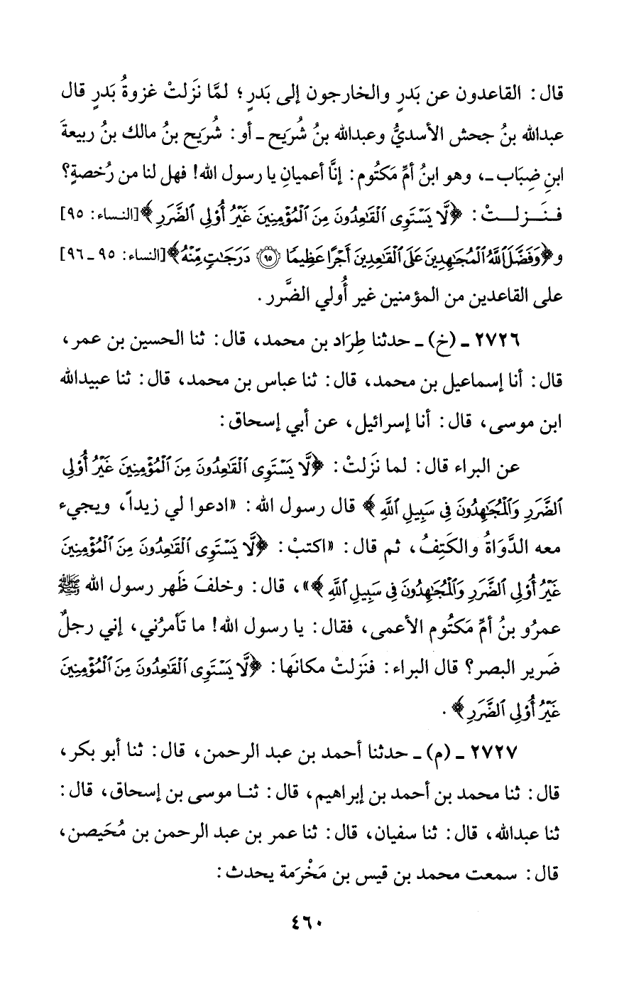 عن البراء قال: لما نزلت: {لا يستوي القاعدون من المؤمنين غير أولي الضرر والمجاهدون في سبيل الله} قال رسول الله: ((ادعوا لي زيدا، ويجيء معه الدواة والكتف، ثم قال: ((اكتب: {لا يستوي القاعدون من المؤمنين غير أولي الضرر والمجاهدون في سبيل الله}))، قال: وخلف ظهر رسول الله صلى الله عليه وسلم عمرو بن أم مكتوم الأعمى، فقال: يا رسول الله! ما تأمرني، إني رجل ضرير البصر؟ قال البراء: فنزلت مكانها: {لا يستوي القاعدون من المؤمنين غير أولي الضرر}.