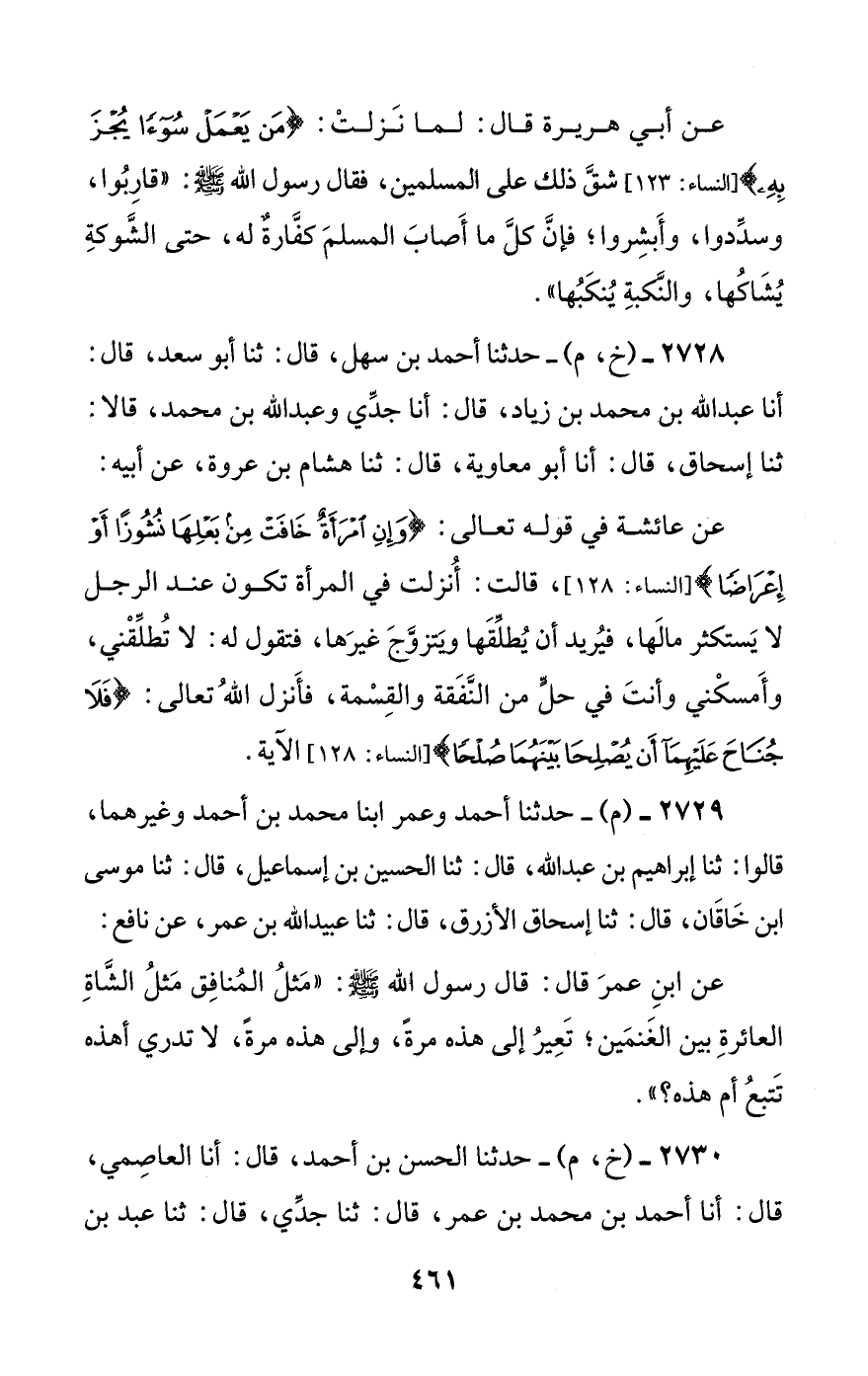 2728 - (خ، م) - حدثنا أحمد بن سهل، قال: ثنا أبو سعد، قال: أنا عبد الله بن محمد بن زياد، قال: أنا جدي وعبد الله بن محمد، قالا: ثنا إسحاق، قال: أنا أبو معاوية، قال: ثنا هشام بن عروة، عن أبيه:
