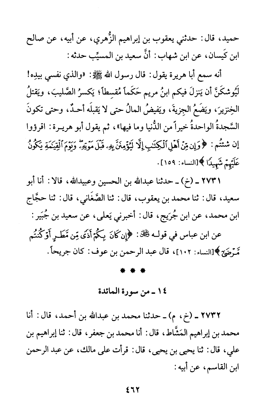2732 - (خ، م) - حدثنا محمد بن عبد الله بن أحمد، قال: أنا محمد بن إبراهيم المشاط، قال: أنا محمد بن جعفر، قال: ثنا إبراهيم بن علي، قال: ثنا يحيى بن يحيى، قال: قرأت على مالك، عن عبد الرحمن بن القاسم، عن أبيه: