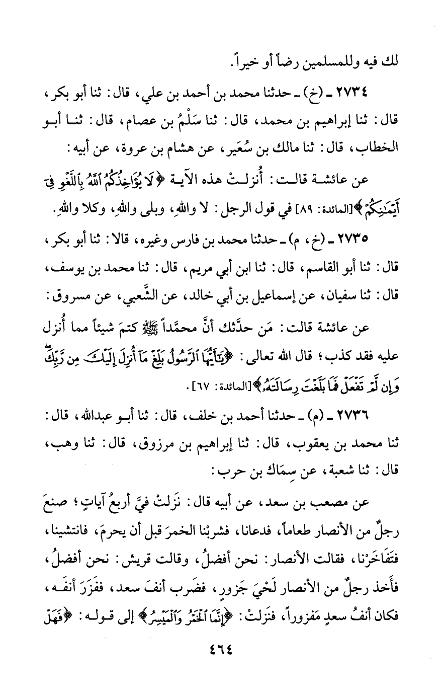 2734 - (خ) - حدثنا محمد بن أحمد بن علي، قال: ثنا أبو بكر، قال: ثنا إبراهيم بن محمد، قال: ثنا سلم بن عصام، قال: ثنا أبو الخطاب، قال: ثنا مالك بن سعير، عن هشام بن عروة، عن أبيه: