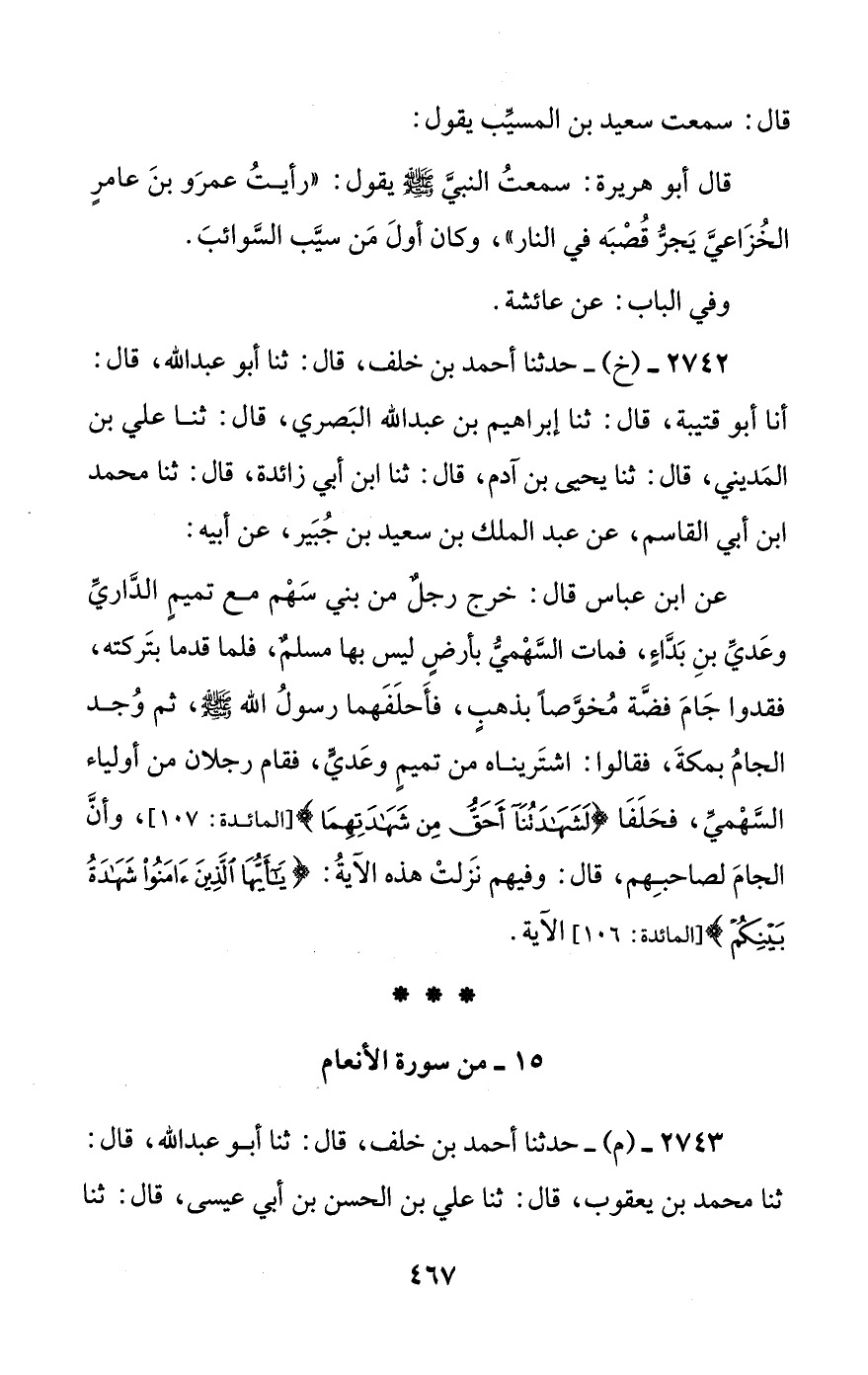 2742 - (خ) - حدثنا أحمد بن خلف، قال: ثنا أبو عبد الله، قال: أنا أبو قتيبة، قال: ثنا إبراهيم بن عبد الله البصري، قال: ثنا علي بن المديني، قال: ثنا يحيى بن آدم، قال: ثنا ابن أبي زائدة، قال: ثنا محمد ابن أبي القاسم، عن عبد الملك بن سعيد بن جبير، عن أبيه: