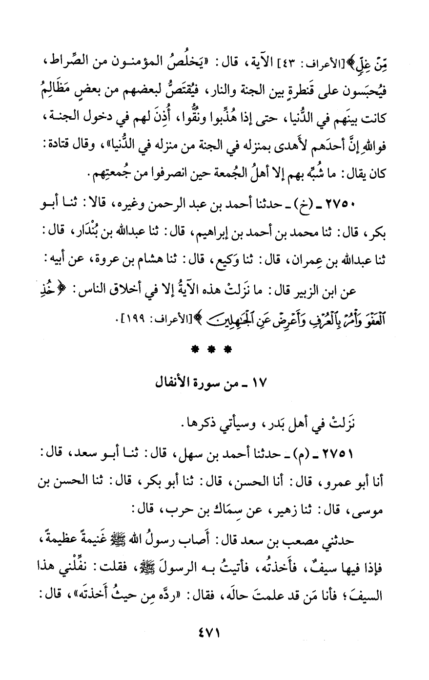 حدثني مصعب بن سعد قال: أصاب رسول الله صلى الله عليه وسلم غنيمة عظيمة، فإذا فيها سيف، فأخذته، فأتيت به الرسول صلى الله عليه وسلم، فقلت: نفلني هذا السيف؛ فأنا من قد علمت حاله، فقال: ((رده من حيث أخذته))، قال: #472# فانطلقت حتى أردت أن ألقيه في القبض لامتني نفسي، فرجعت إليه، فقلت: أعطنيه، قال: فشد لي صوته: ((رده من حيث أخذته))، قال: فأنزل الله تعالى: {يسئلونك عن الأنفال} الآية.