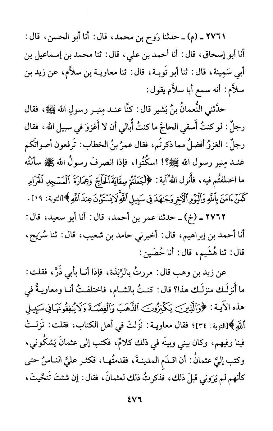 حدثني النعمان بن بشير قال: كنا عند منبر رسول الله صلى الله عليه وسلم، فقال رجل: لو كنت أسقي الحاج ما كنت أبالي أن لا أغزو في سبيل الله، فقال رجل: الغزو أفضل مما ذكرتم، فقال عمر بن الخطاب: ترفعون أصواتكم عند منبر رسول الله صلى الله عليه وسلم؟! اسكتوا، فإذا انصرف رسول الله صلى الله عليه وسلم سألته ما اختلفتم فيه، فأنزل الله آية: {أجعلتم سقاية الحاج وعمارة المسجد الحرام كمن آمن بالله واليوم الآخر وجاهد في سبيل الله لا يستوون عند الله}.