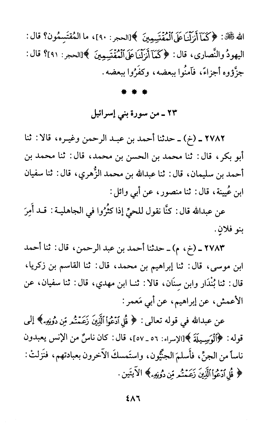 2782 - (خ) - حدثنا أحمد بن عبد الرحمن وغيره، قالا: ثنا أبو بكر، قال: ثنا محمد بن الحسن بن محمد، قال: ثنا محمد بن أحمد بن سليمان، قال: ثنا عبد الله بن محمد الزهري، قال: ثنا سفيان بن عيينة، قال: ثنا منصور، عن أبي وائل: