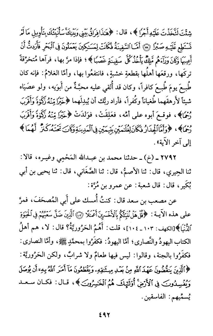 عن مصعب بن سعد قال: كنت أمسك على أبي المصحف، فمر على هذه الآية: {قل هل ننبئكم بالأخسرين أعمالا. الذين ضل سعيهم في الحياة الدنيا}، قلت أهم الحرورية؟ قال: لا، هم أهل الكتاب اليهود والنصارى؛ أما اليهود: فكفروا بمحمد صلى الله عليه وسلم، وأما النصارى: فكفروا بالجنة، وقالوا: ليس فيها طعام ولا شراب، ولكن الحرورية: {الذين ينقضون عهد الله من بعد ميثاقه ويقطعون ما أمر الله به أن يوصل ويفسدون في الأرض أولئك هم الخاسرون}، قال: فكان سعد يسميهم: الفاسقين.