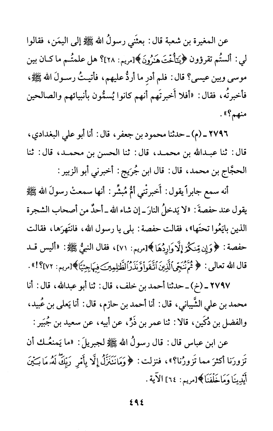 2797 - (خ) - حدثنا أحمد بن خلف، قال: ثنا أبو عبد الله، قال: أنا محمد بن علي الشيباني، قال: أنا أحمد بن حازم، قال: أنا يعلى بن عبيد، والفضل بن دكين، قالا: ثنا عمر بن ذر، عن أبيه، عن سعيد بن جبير: