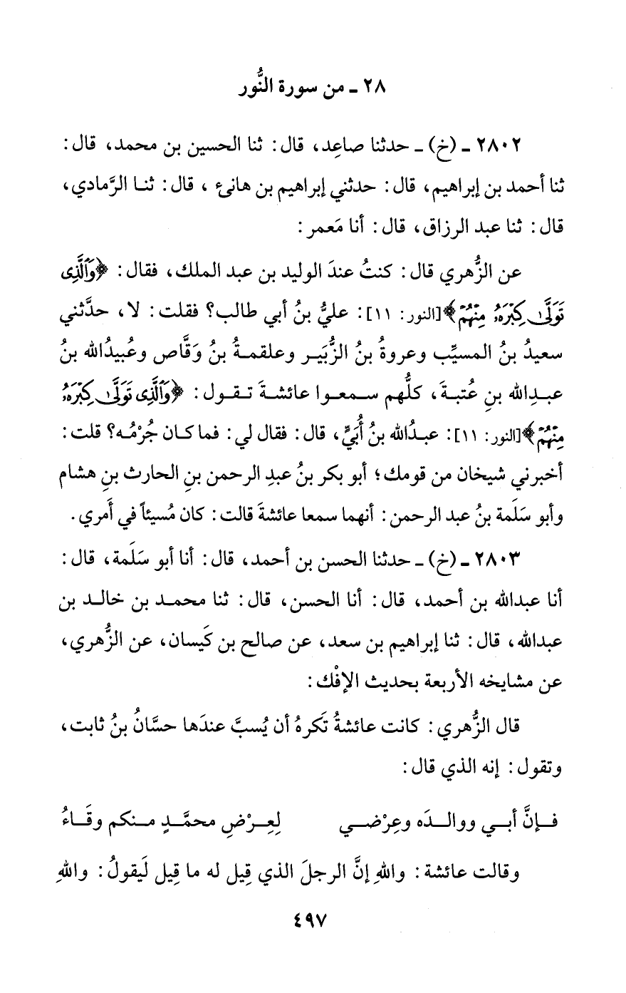 2803 - (خ) - حدثنا الحسن بن أحمد، قال: أنا أبو سلمة، قال: أنا عبد الله بن أحمد، قال: أنا الحسن، قال: ثنا محمد بن خالد بن عبد الله، قال: ثنا إبراهيم بن سعد، عن صالح بن كيسان، عن الزهري، عن مشايخه الأربعة بحديث الإفك: