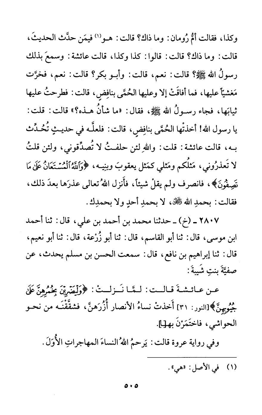 2807 - (خ) - حدثنا محمد بن أحمد بن علي، قال: ثنا أحمد بن موسى، قال: ثنا أبو القاسم، قال: ثنا أبو زرعة، قال: ثنا أبو نعيم، قال: ثنا إبراهيم بن نافع، قال: سمعت الحسن بن مسلم يحدث، عن صفية بنت شيبة: