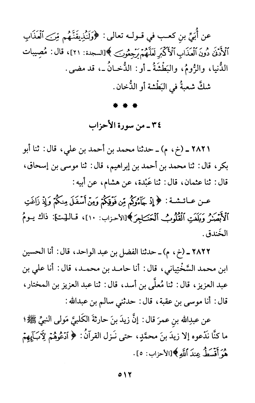 2821 - (خ، م) - حدثنا محمد بن أحمد بن علي، قال: ثنا أبو بكر، قال: ثنا محمد بن أحمد بن إبراهيم، قال: ثنا موسى بن إسحاق، قال: ثنا عثمان، قال: ثنا عبدة، عن هشام، عن أبيه: