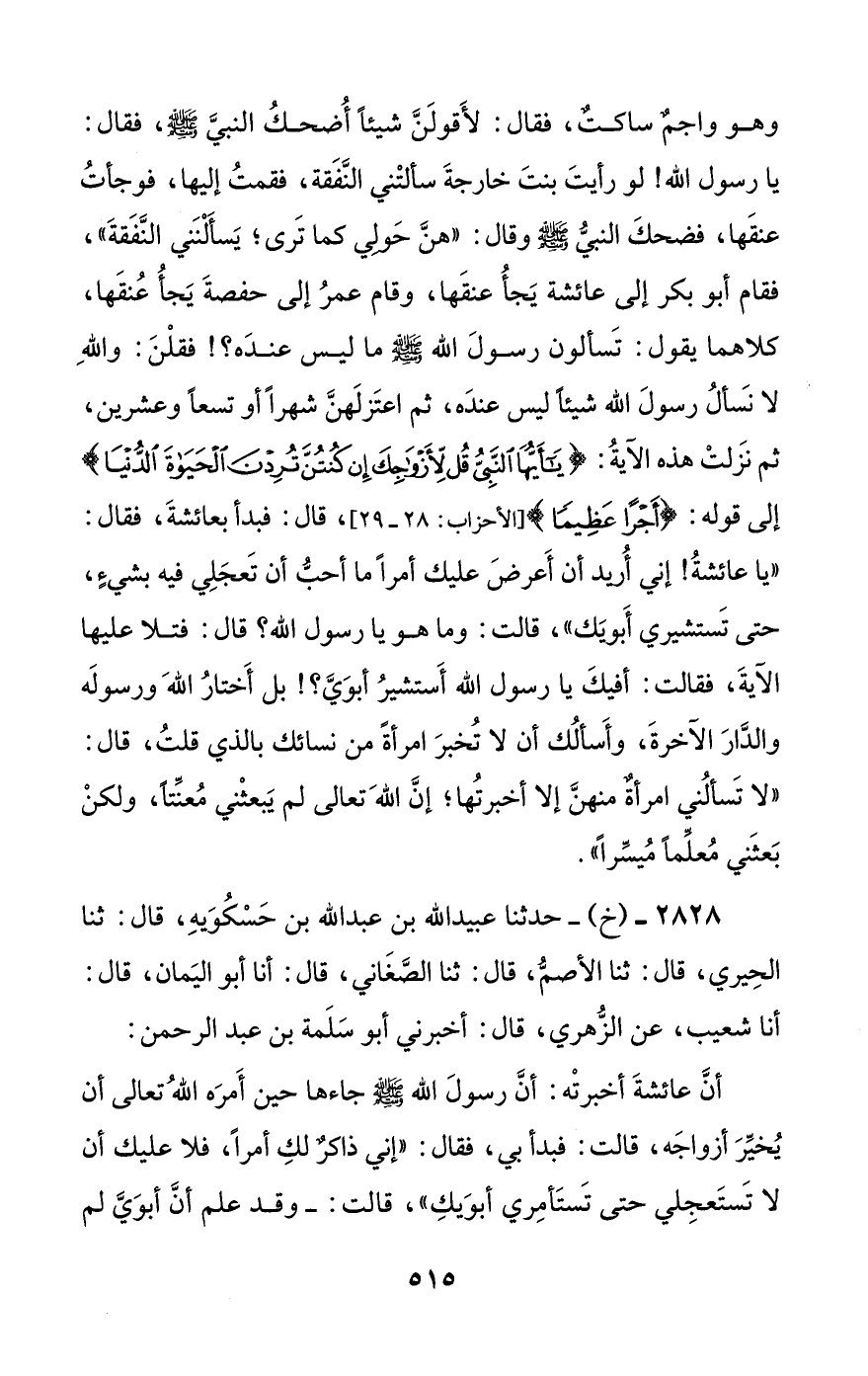 2828 - (خ) - حدثنا عبيد الله بن عبد الله بن حسكويه، قال: ثنا الحيري، قال: ثنا الأصم، قال: ثنا الصغاني، قال: أنا أبو اليمان، قال: أنا شعيب، عن الزهري، قال: أخبرني أبو سلمة بن عبد الرحمن: