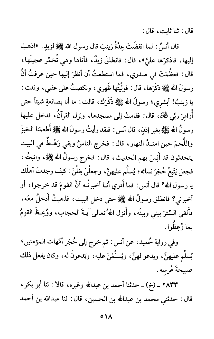 2833 - (خ) - حدثنا أحمد بن عبد الله وغيره، قالا: ثنا أبو بكر، قال: حدثني محمد بن عبد الله بن الحسين، قال: ثنا عبد الله بن أحمد #519# ابن موسى، قال: ثنا عمران بن موسى، قال: ثنا عبد الوارث، قال: ثنا عبد العزيز بن صهيب: