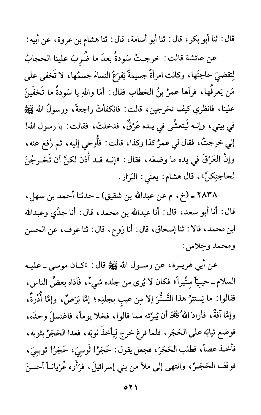 عن أبي هريرة، عن رسول الله صلى الله عليه وسلم قال: ((كان موسى -عليه السلام- حييا ستيرا؛ فكان لا يرى من جلده شيء، فآذاه بعض الناس، فقالوا: ما يستتر هذا التستر إلا من عيب بجلده؛ إما برص، وإما أدرة، وإما آفة، فأراد الله عز وجل أن يبرئه مما قالوا، فخلا يوما، فاغتسل وحده، فوضع ثيابه على الحجر، فلما فرغ خرج ليأخذ ثوبه، فعدا الحجر بثوبه، فأخذ عصا، فطلب الحجر، فجعل يقول: حجر! ثوبي، حجر! ثوبي، فوقف الحجر، وانتهى إلى ملأ من بني إسرائيل، فرأوه عريانا أحسن #522# ما خلق الله عز وجل وأبرأه مما يقولون، قال: فأخذ ثيابه وجعل يضرب الحجر بعصا، فوالله إن للحجر لندبا من أثر ضربه ثلاثا أو أربعا أو خمسا؛ فذلك قوله عز وجل: {يأيها الذين آمنوا لا تكونوا كالذين آذوا موسى فبرأه الله مما قالوا وكان عند الله وجيها}.