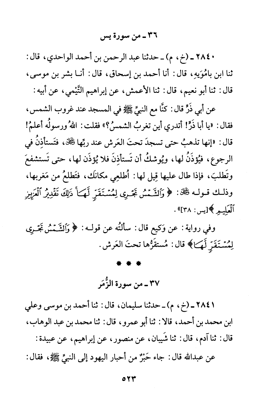 عن أبي ذر قال: كنا مع النبي صلى الله عليه وسلم في المسجد عند غروب الشمس، فقال: ((يا أبا ذر! أتدري أين تغرب الشمس؟)) فقلت: الله ورسوله أعلم! قال: ((إنها تذهب حتى تسجد تحت العرش عند ربها عز وجل، فتستأذن في الرجوع، فيؤذن لها، ويوشك أن تستأذن فلا يؤذن لها، حتى تستشفع وتطلب، فإذا طال عليها قيل لها: اطلعي مكانك، فتطلع من مغربها، وذلك قوله عز وجل: {والشمس تجري لمستقر لها ذلك تقدير العزيز العليم})).