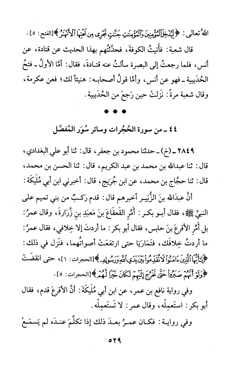 أن عبد الله بن الزبير أخبرهم قال: قدم ركب من بني تميم على النبي صلى الله عليه وسلم، فقال أبو بكر: أمر القعقاع بن معبد بن زرارة، وقال عمر: بل أمر الأقرع بن حابس، فقال أبو بكر: ما أردت إلا خلافي، فقال عمر: ما أردت خلافك، فتماريا حتى ارتفعت أصواتهما، فنزل في ذلك: {يأيها الذين آمنوا لا تقدموا بين يدي الله ورسوله}، حتى انقضت {ولو أنهم صبروا حتى تخرج إليهم لكان خيرا لهم}.