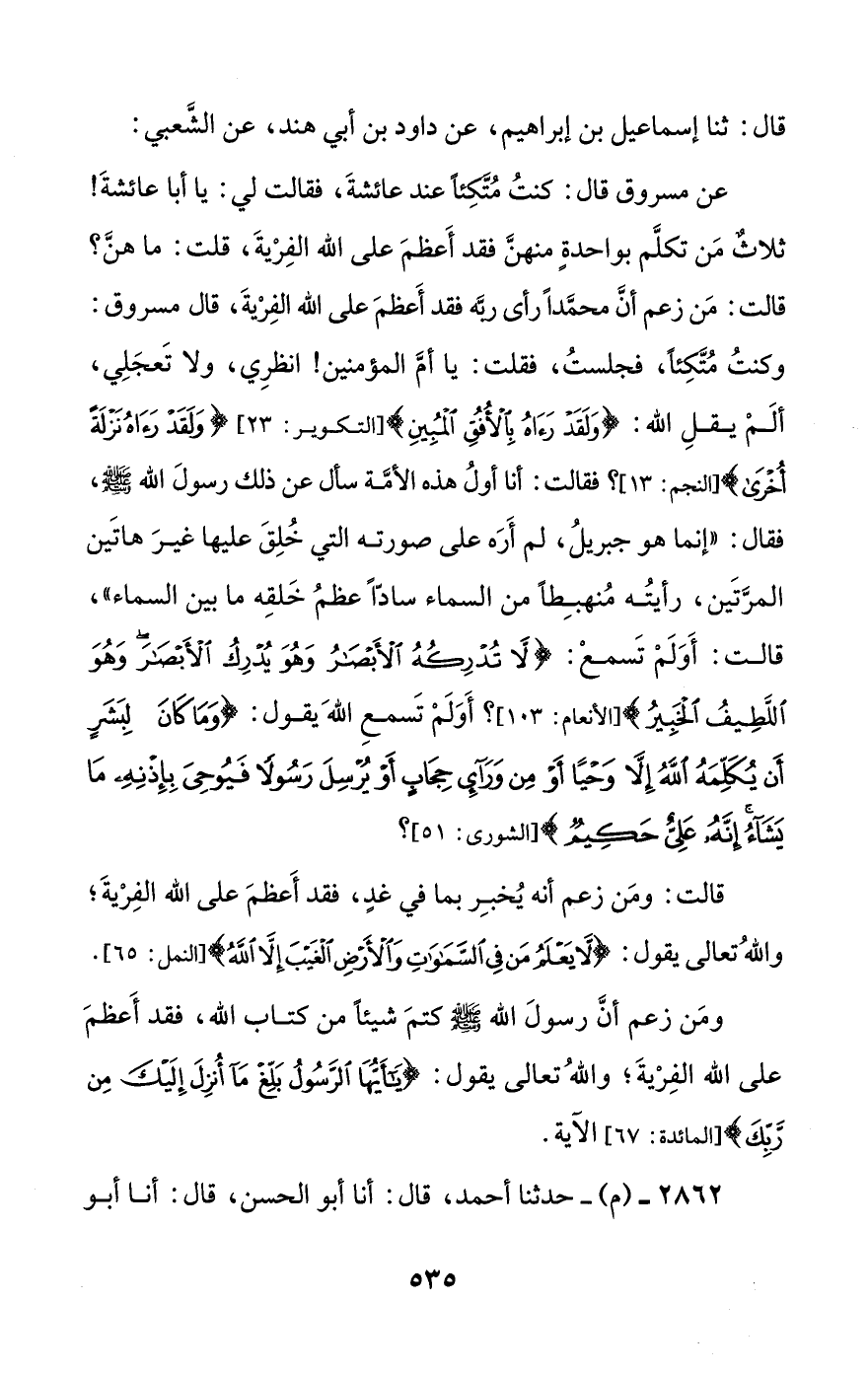 عن مسروق قال: قلت لها: يا أمتاه! هل رأى محمد ربه؟ فقالت: لقد قف شعري مما قلت؛ قد رأى جبريل في صورته مرتين.