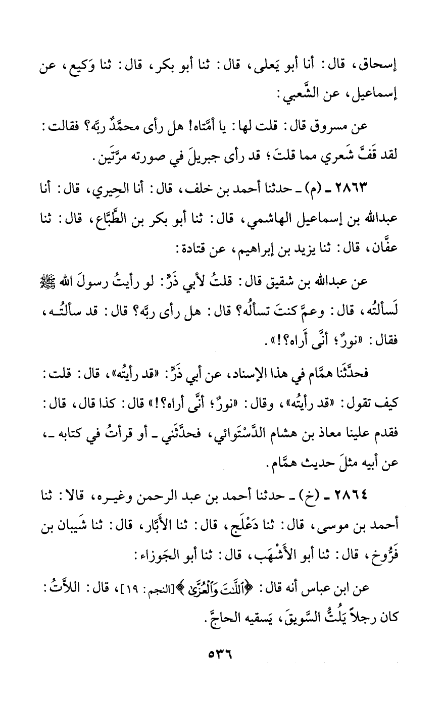 عن عبد الله بن شقيق قال: قلت لأبي ذر: لو رأيت رسول الله صلى الله عليه وسلم لسألته، قال: وعم كنت تسأله؟ قال: هل رأى ربه؟ قال: قد سألته، فقال: ((نور؛ أنى أراه؟!)).