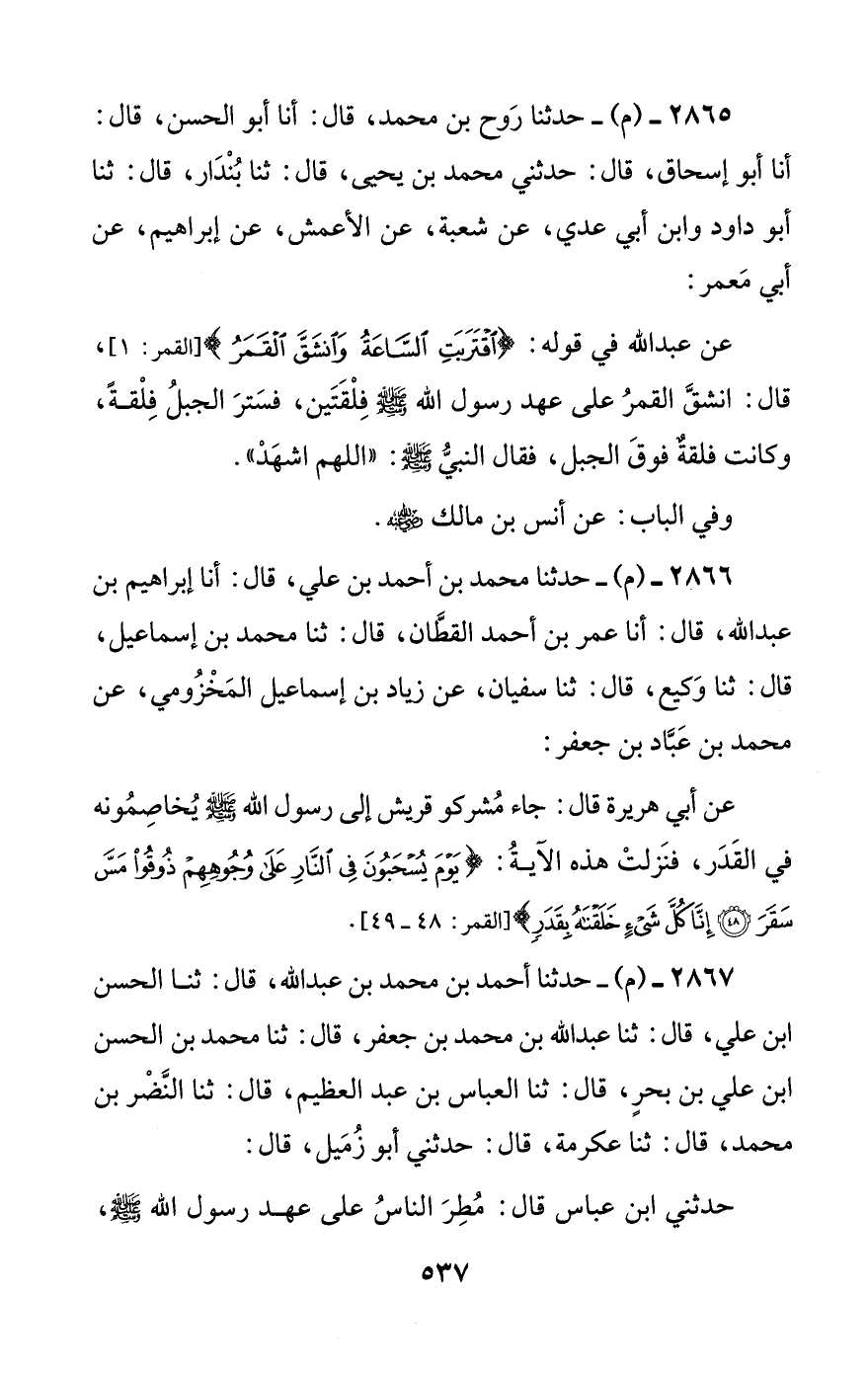عن عبد الله في قوله: {اقتربت الساعة وانشق القمر}، قال: انشق القمر على عهد رسول الله صلى الله عليه وسلم فلقتين، فستر الجبل فلقة، وكانت فلقة فوق الجبل، فقال النبي صلى الله عليه وسلم: ((اللهم اشهد)).